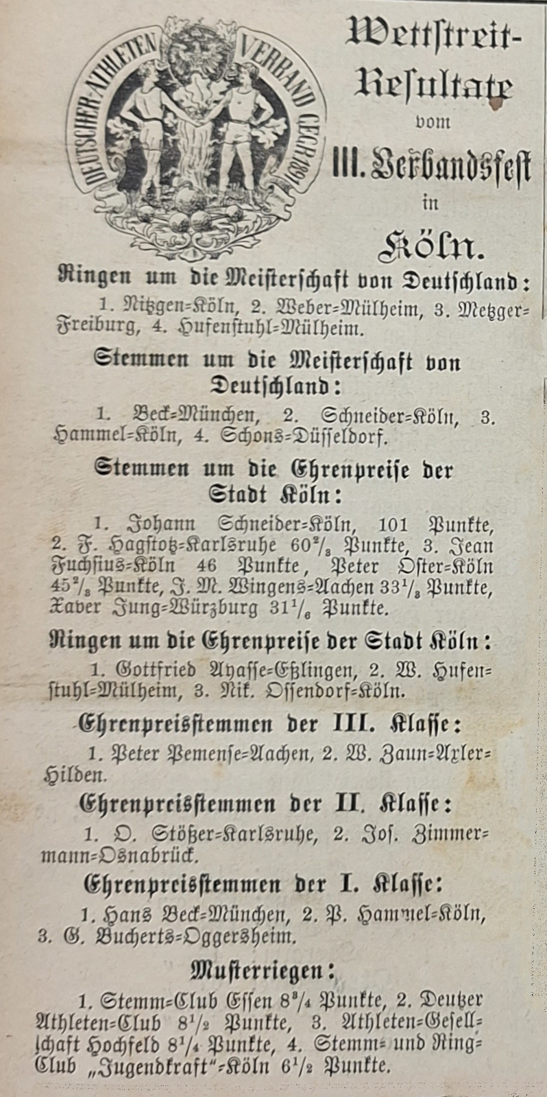 17. bis 18. Oktober: „Athleten-Wettstreit des 1. deutschen Kreises“ im Ringen Klasse I in Köln (Deutschland) – 1. Platz