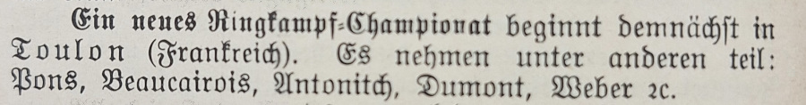 29. September bis 17. Oktober: „Großer Preis von Budapest“ (Österreich-Ungarn [heute: Ungarn]) – Debüt als Berufsringer