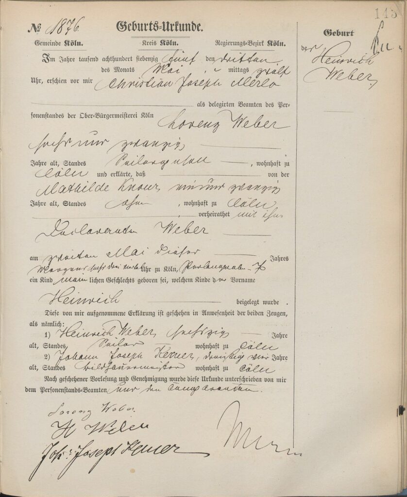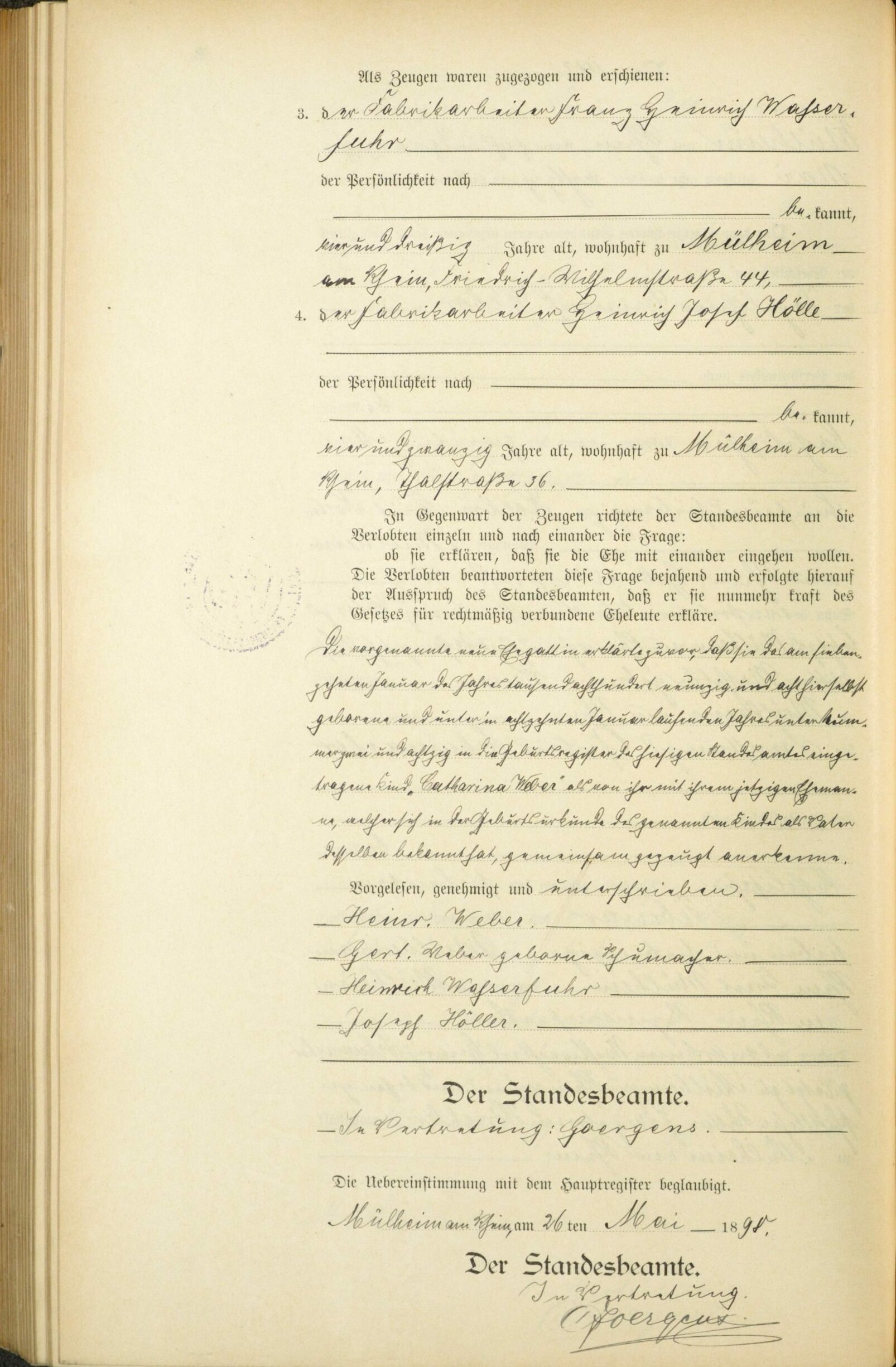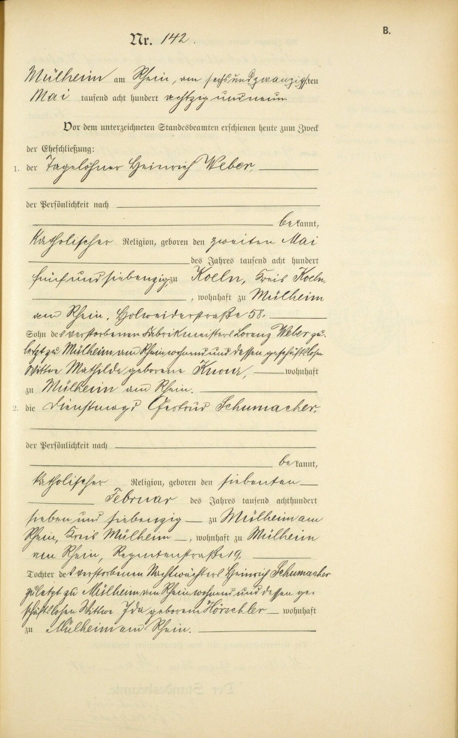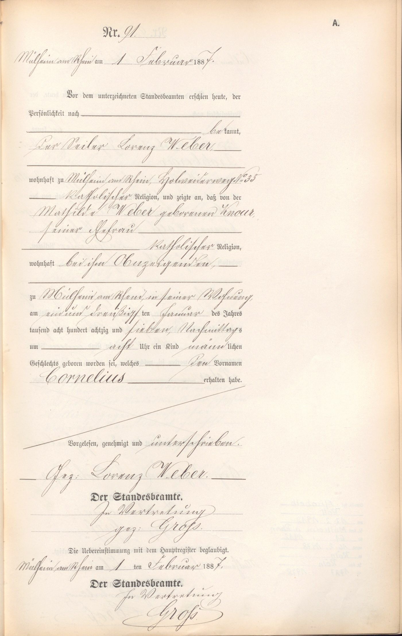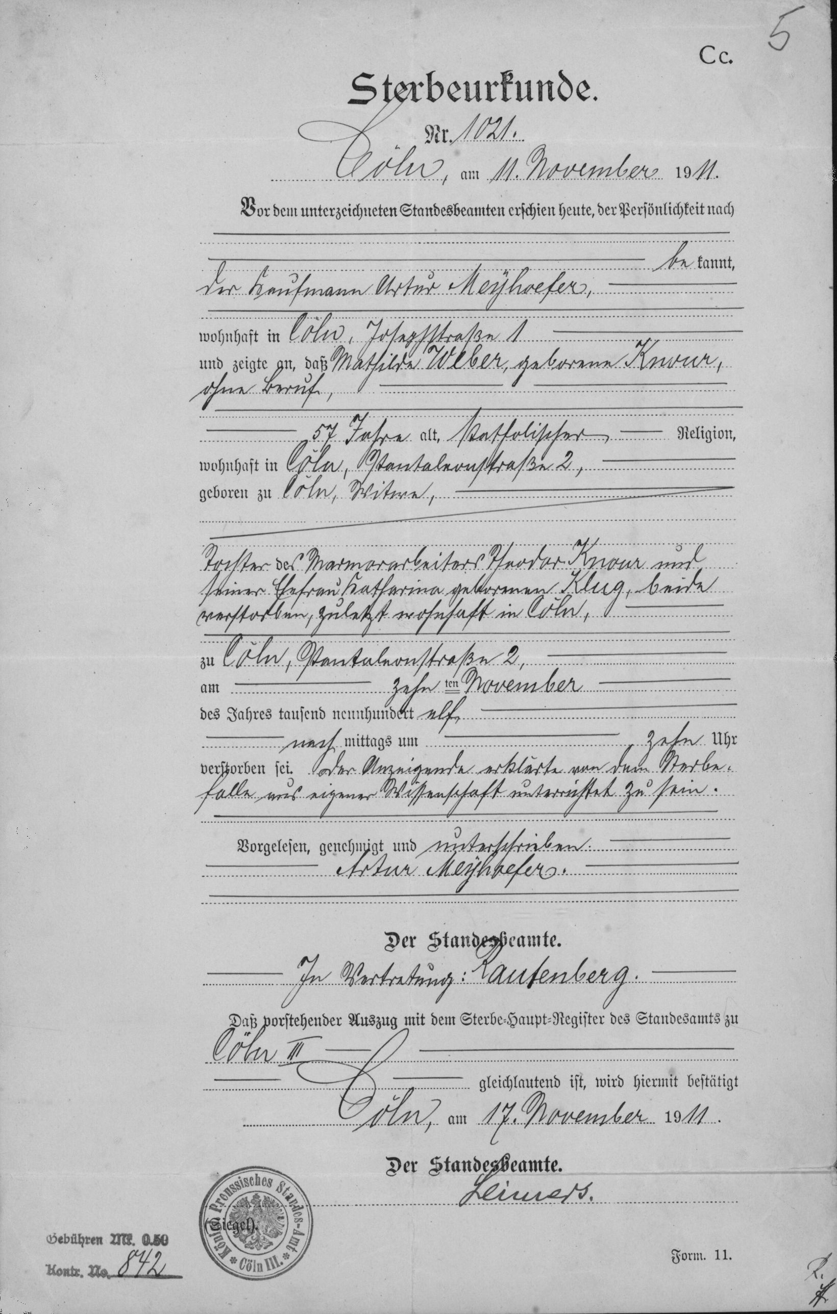 Auf Grund schriftlicher Anzeige des hiesigen Polizei-Commissars Herwagen, vom heutigen Tage, wird hierdurch beurkundet, daß der Fabrikmeister Lorenz Weber, ein und vierzig Jahre alt, katholischer Religion, wohnhaft zu Mülheim am Rhein Holweiderstraße No. 58, geboren zu Köln Kreis Köln, Ehemann der geschäftslosen Mathilde Knour, Sohn der zu Köln verstorbenen Eheleute Seiler Heinrich Weber und der geschäftslosen Klara geborenen Krupp, zu Mülheim am Rhein Holweiderstraße No. 58, am zweiten October des Jahres tausend achthundert neunzig und eins, Nachmittags acht ein halb Uhr, verstorben sei.