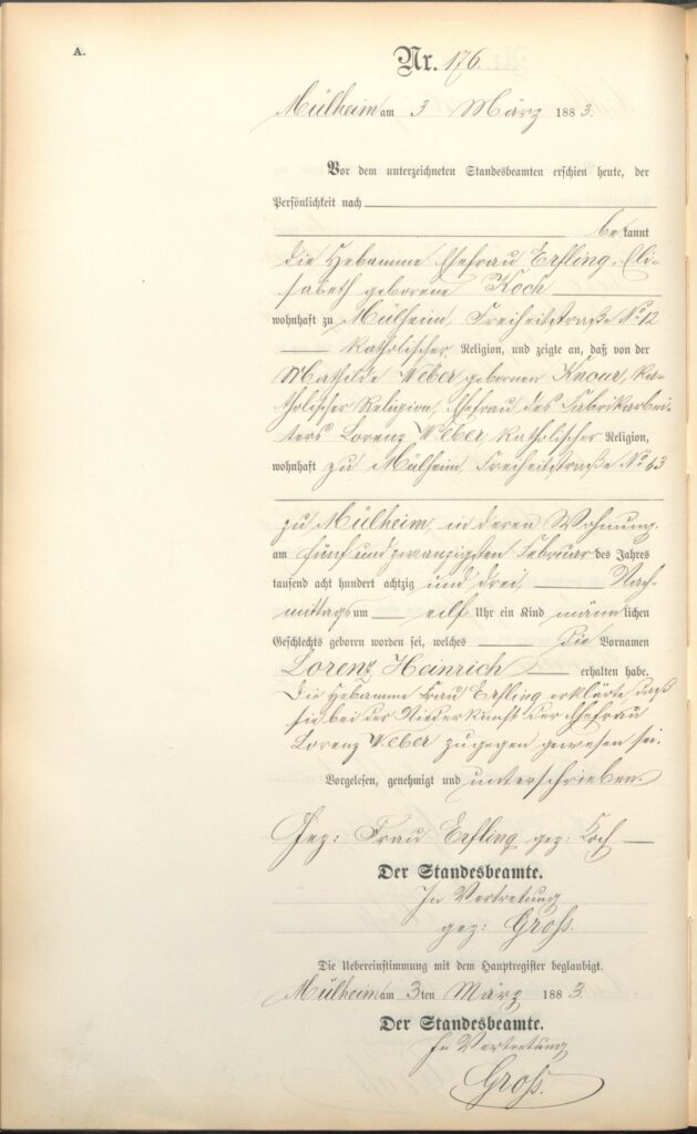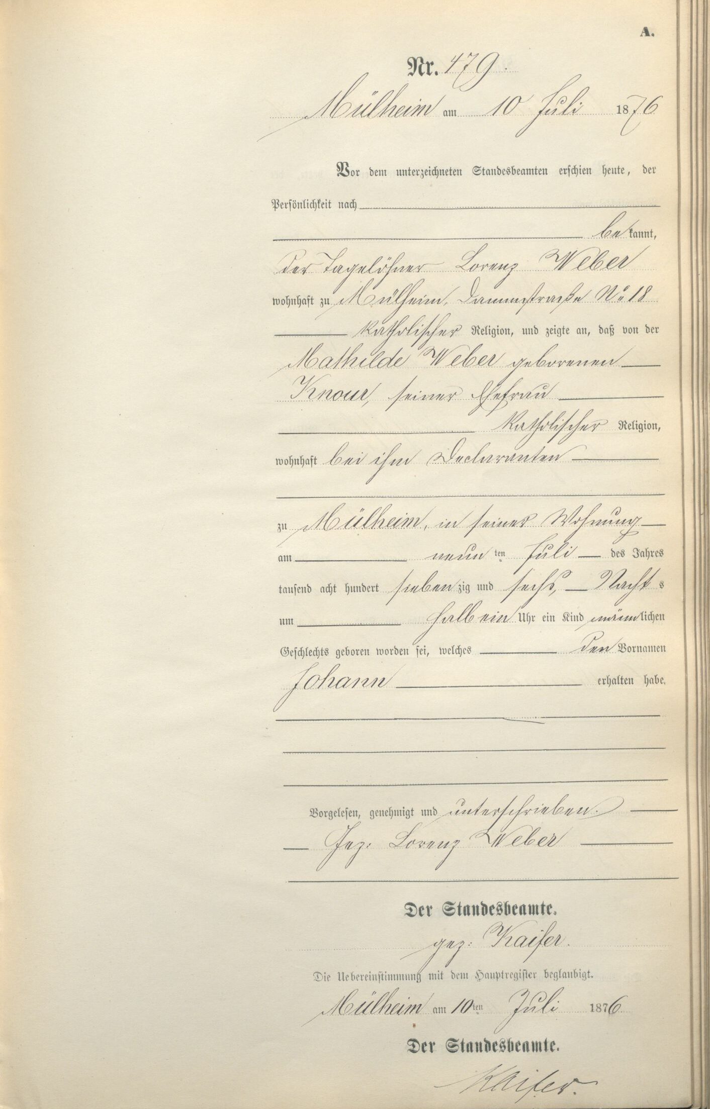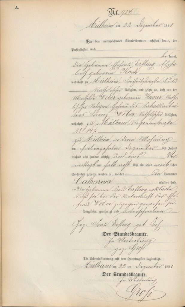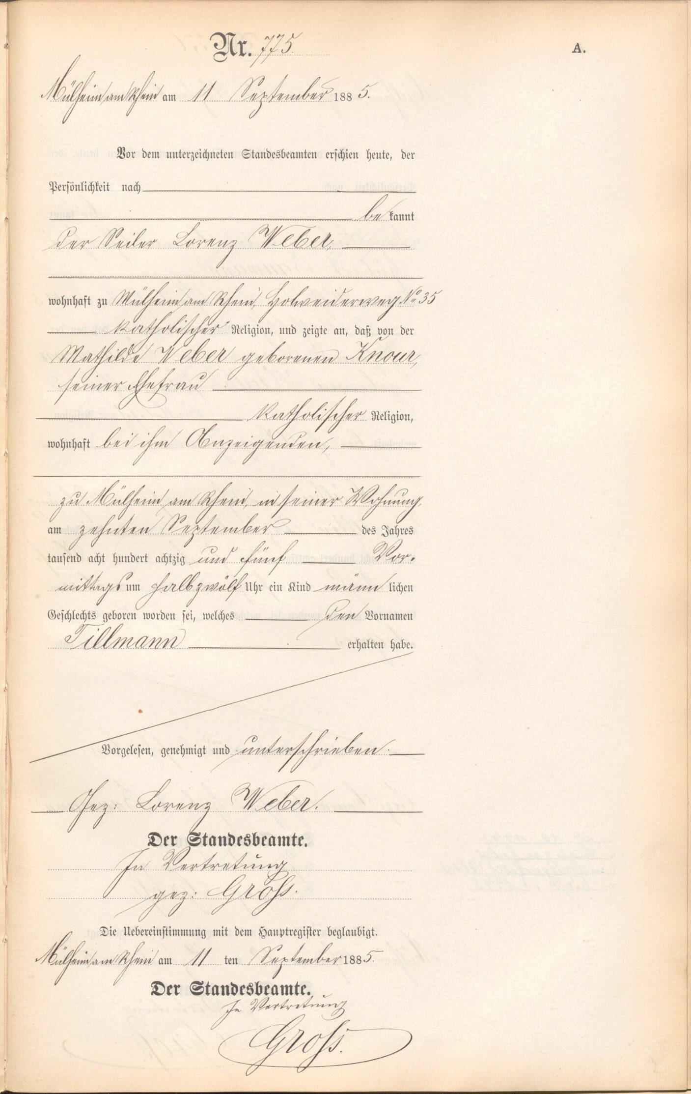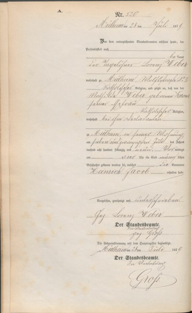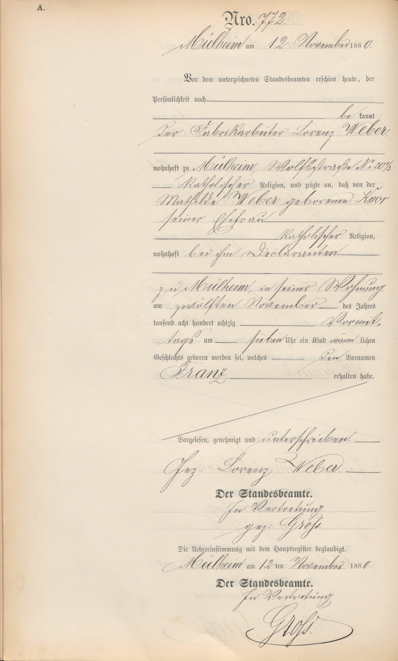 Auf Grund schriftlicher Anzeige des hiesigen Polizei-Commissars Herwagen, vom heutigen Tage, wird hierdurch beurkundet, daß der Fabrikmeister Lorenz Weber, ein und vierzig Jahre alt, katholischer Religion, wohnhaft zu Mülheim am Rhein Holweiderstraße No. 58, geboren zu Köln Kreis Köln, Ehemann der geschäftslosen Mathilde Knour, Sohn der zu Köln verstorbenen Eheleute Seiler Heinrich Weber und der geschäftslosen Klara geborenen Krupp, zu Mülheim am Rhein Holweiderstraße No. 58, am zweiten October des Jahres tausend achthundert neunzig und eins, Nachmittags acht ein halb Uhr, verstorben sei.
