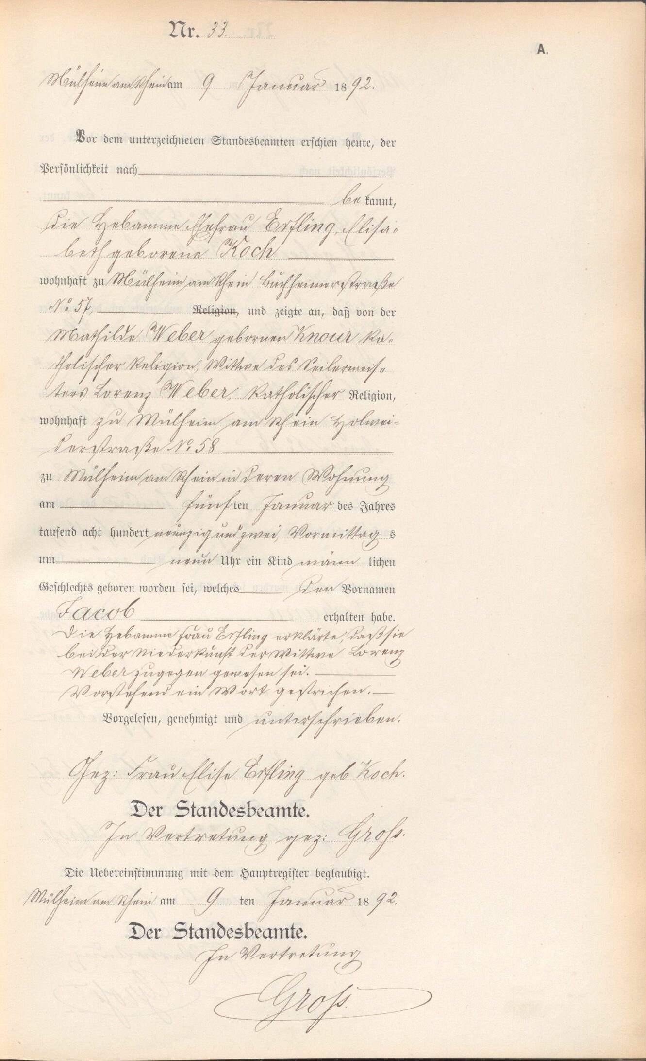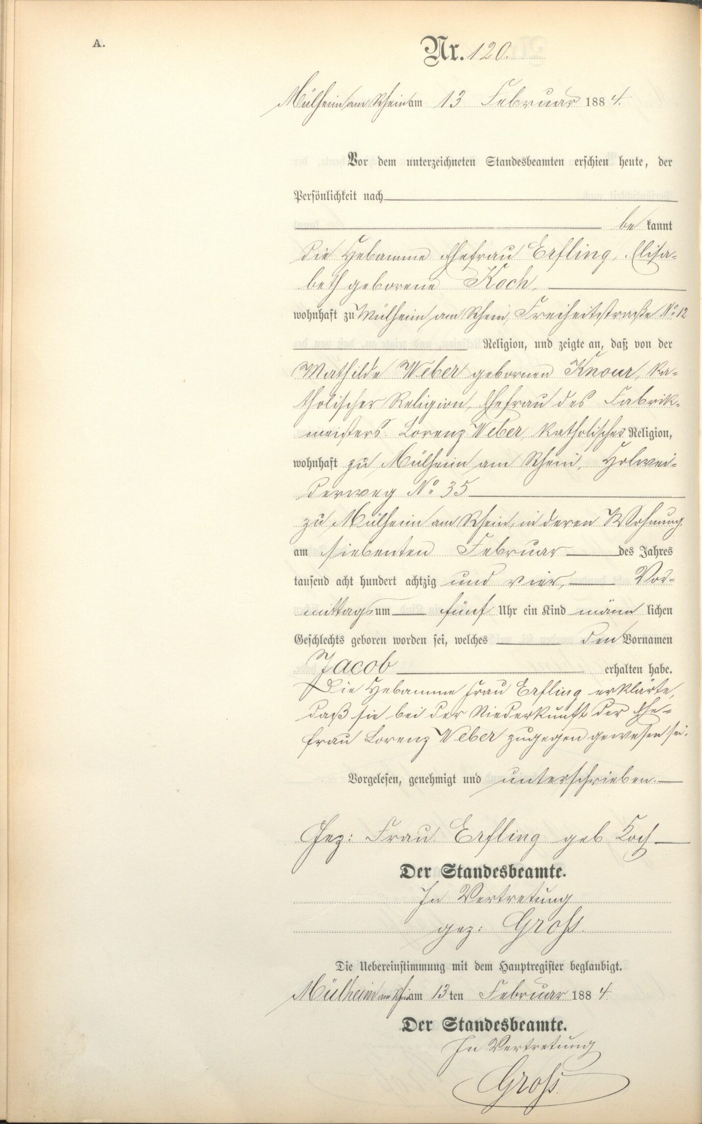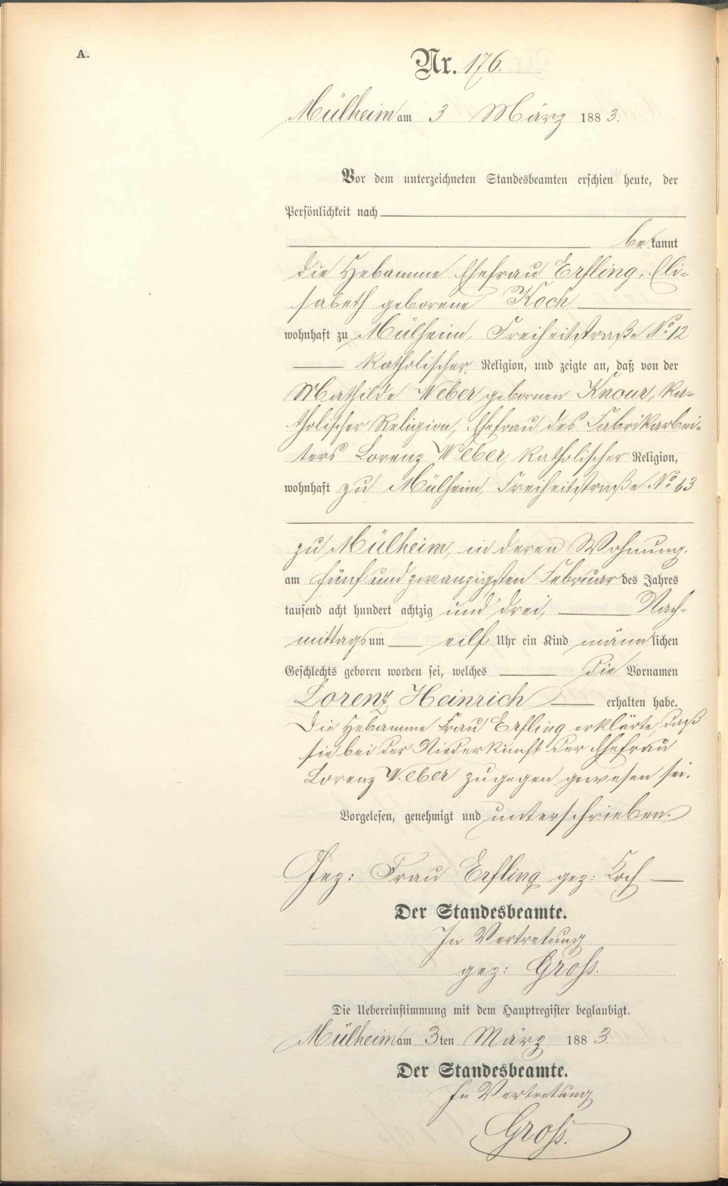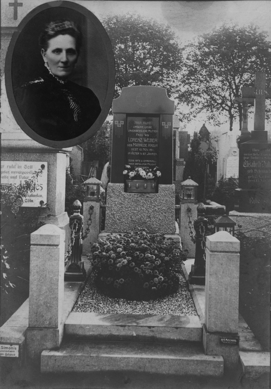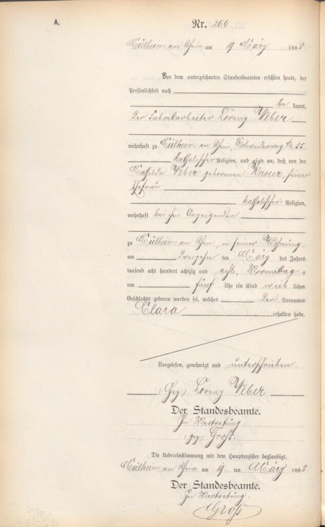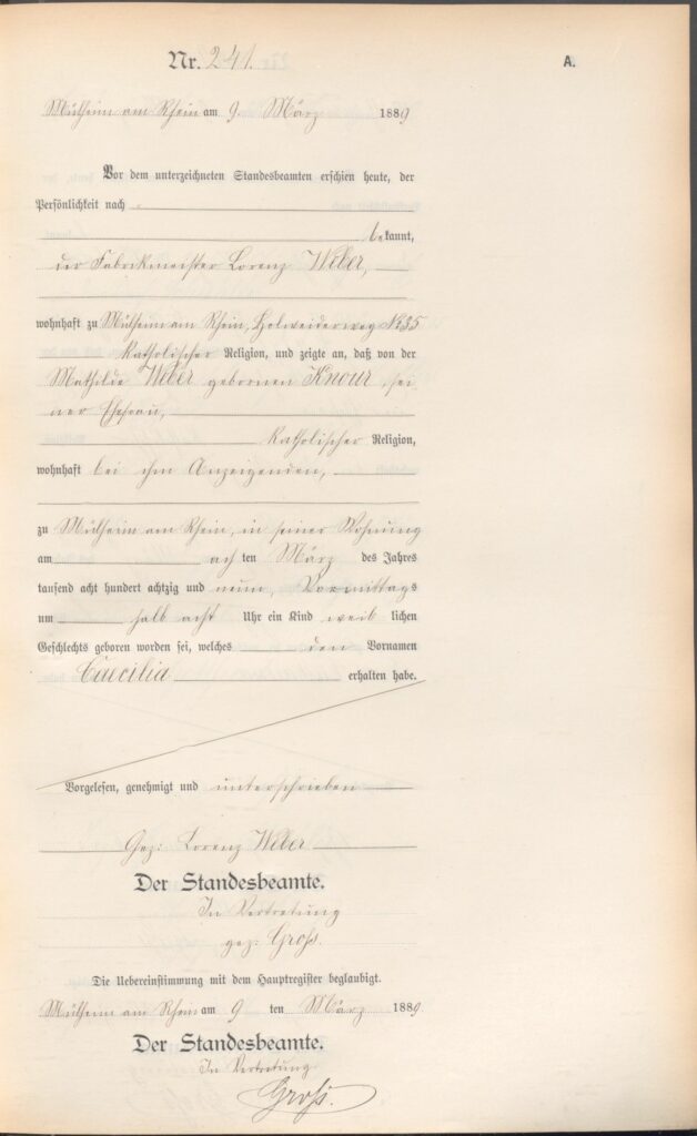 Auf Grund schriftlicher Anzeige des hiesigen Polizei-Commissars Herwagen, vom heutigen Tage, wird hierdurch beurkundet, daß der Fabrikmeister Lorenz Weber, ein und vierzig Jahre alt, katholischer Religion, wohnhaft zu Mülheim am Rhein Holweiderstraße No. 58, geboren zu Köln Kreis Köln, Ehemann der geschäftslosen Mathilde Knour, Sohn der zu Köln verstorbenen Eheleute Seiler Heinrich Weber und der geschäftslosen Klara geborenen Krupp, zu Mülheim am Rhein Holweiderstraße No. 58, am zweiten October des Jahres tausend achthundert neunzig und eins, Nachmittags acht ein halb Uhr, verstorben sei.