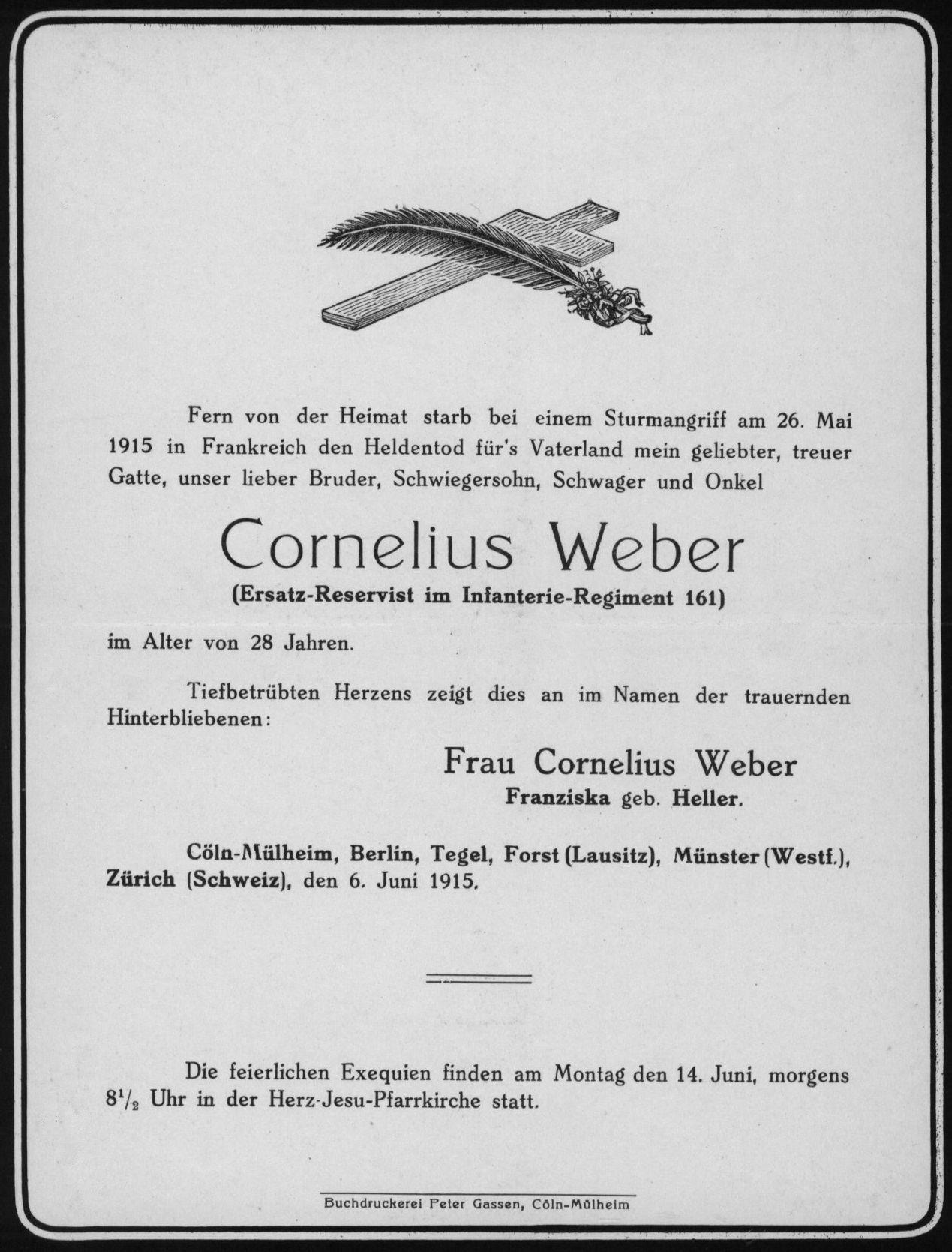 26. Mai: Cornelius Weber [Bruder von Heinrich] stirbt als Soldat im Kriegseinsatz in Frankreich