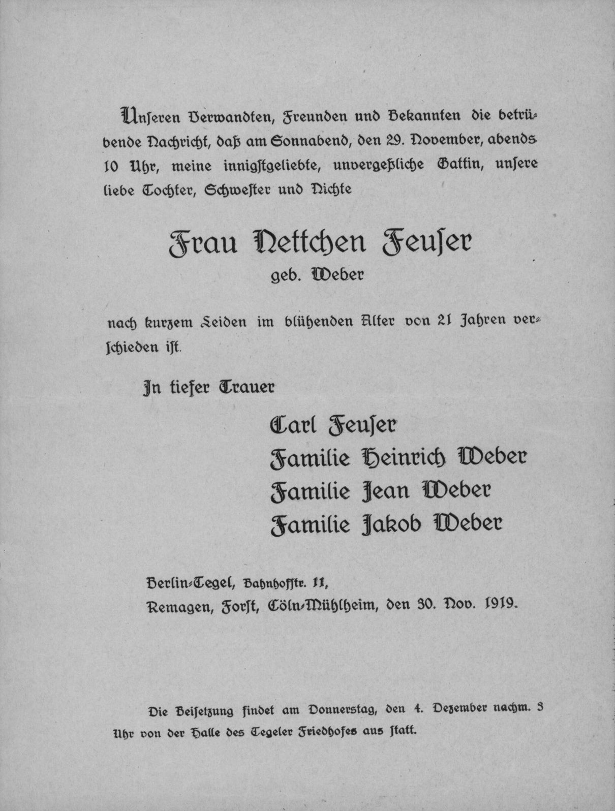 Catharina [„Netta“] Weber [Tochter von Heinrich] heiratet Carl Feuser