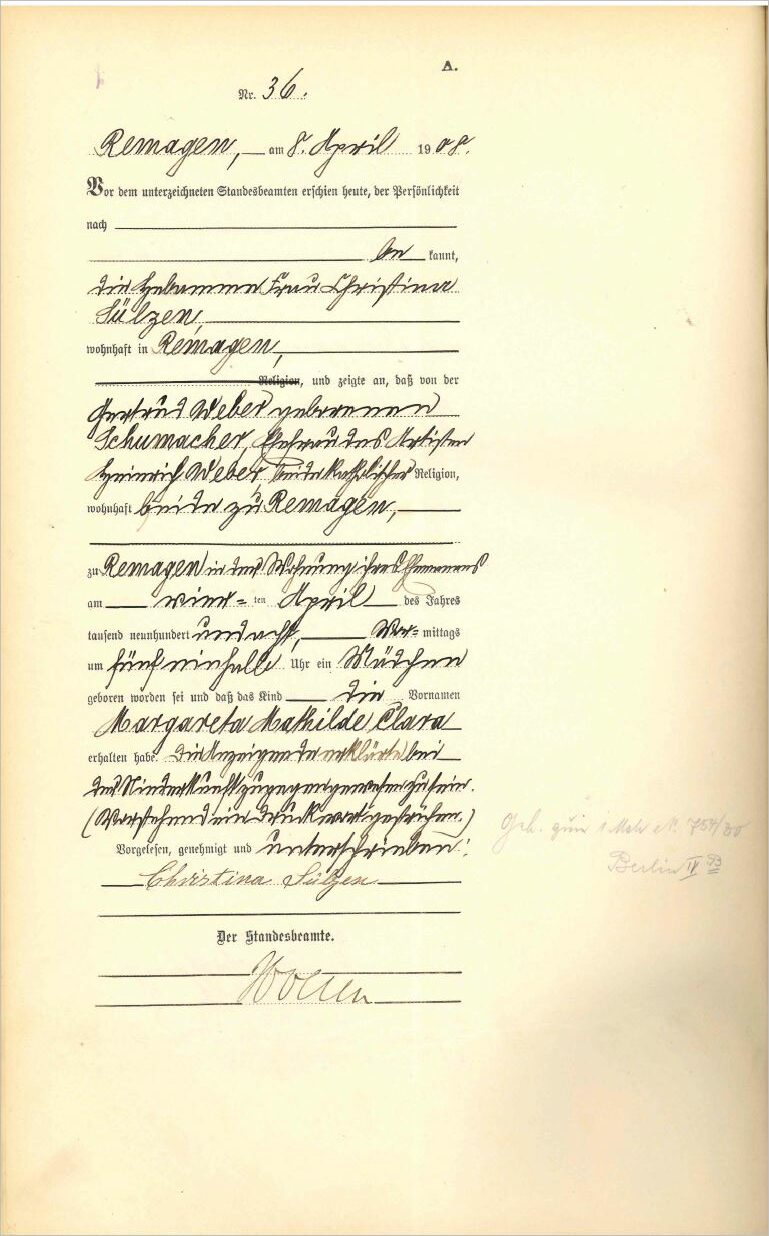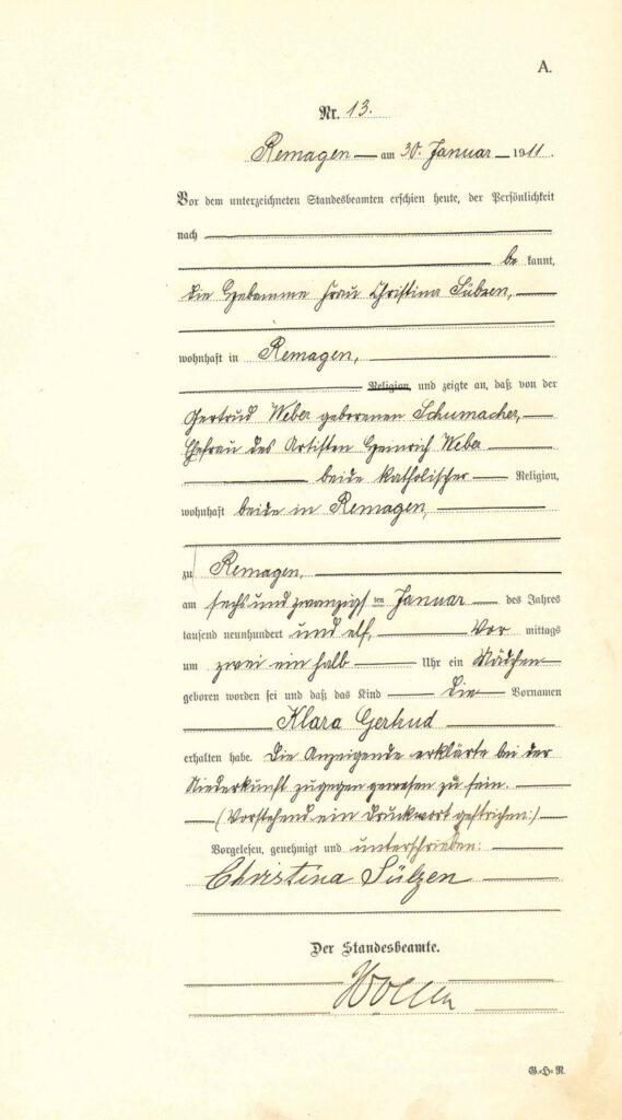 13. März: Geburt Clara [„Clärchen“] Weber [Schwester von Heinrich]