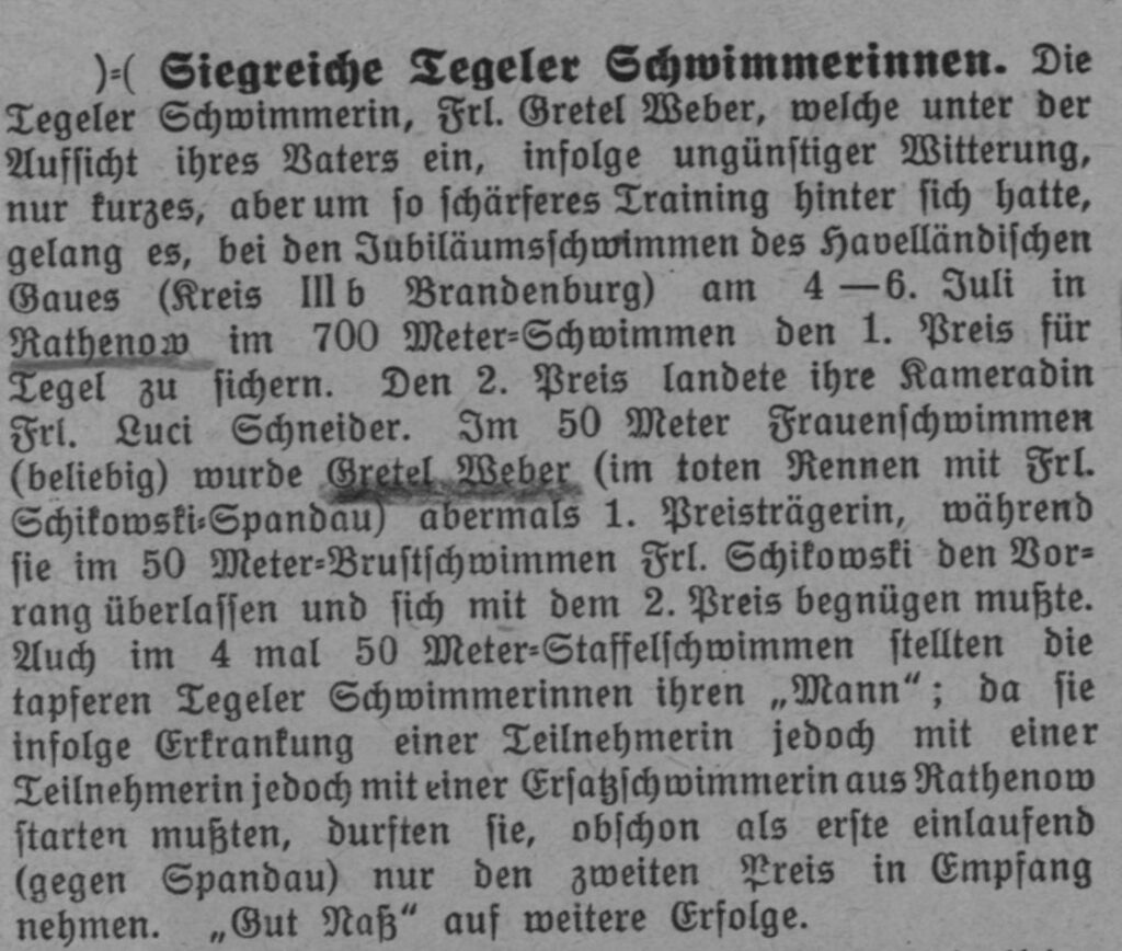 Juli: Heinrich Webers Tochter Margareta Mathilde Clara [„Gretel“] belegt beim Jubiläumsschwimmen in Rathenow im 700- und 50-Meter-Schwimmen den 1. Platz