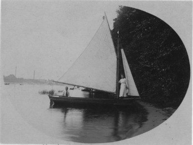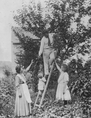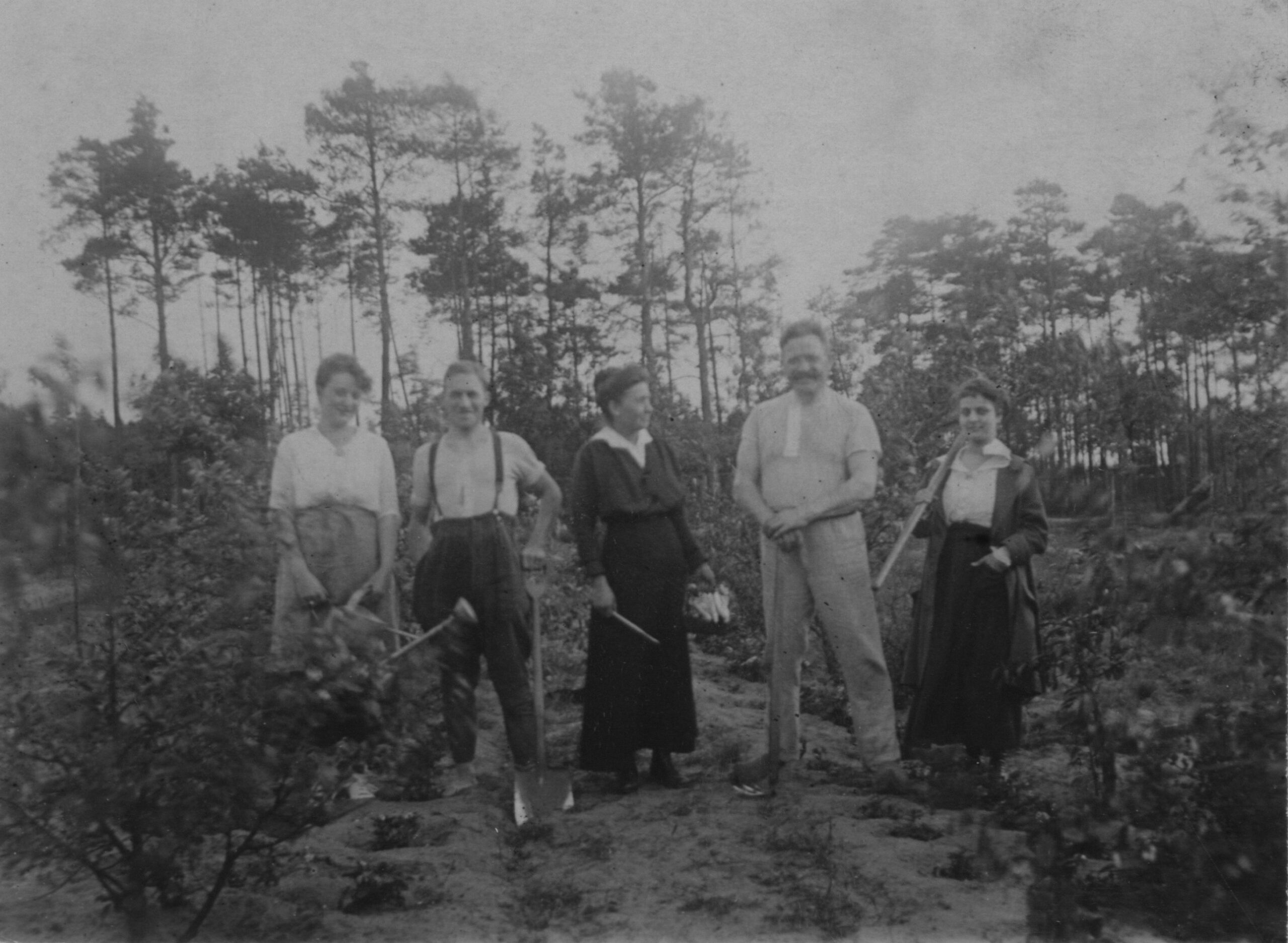 Webers Grundstück in Schulzendorf [b. Berlin] (v.l. Netta, Karl Feuser, Trautchen und Heinrich Weber, Berta Weber [geb. Rademacher, zweite Frau v. Jakob Weber]); Sammlung privat