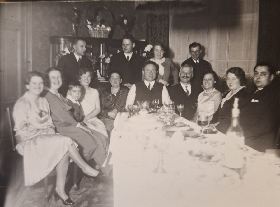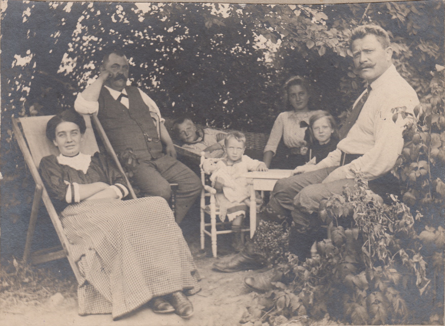 Heinrich Weber (Mitte), Gertrud Weber (Mitte li.), Jean Weber (Mitte re.), stehend von links: Fritz Wendt (Verlobter von Traudi Weber), Jakob Weber, Traudi Weber, sitzend von rechts: Georg Gürtler, Gretel Weber (verheiratete Gürtler); Sammlung Ulrike Henning-Hellmich