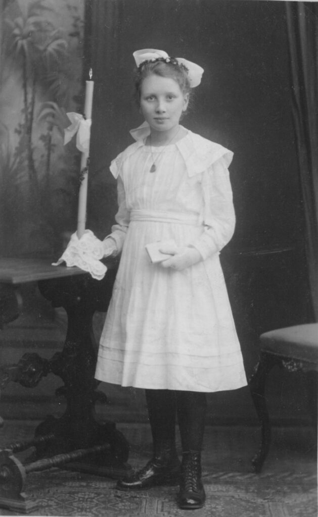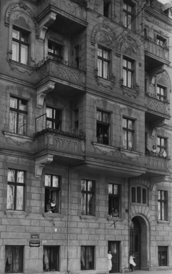 Am Bahnhofsplatz 3 (heute: Am Buddeplatz 3), Berlin-Tegel, erste Wohnanschrift der Familie Weber nach Umzug aus Remagen (erste Etage v.l. Trautchen Weber mit Traudi, Gretel mit Netta); Sammlung privat