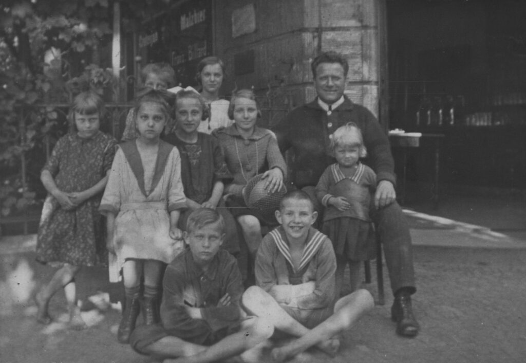 Heinrich Weber und Tochter Traudi (sitzend, li. neben Heinrich Weber) vor seiner Gaststätte mit Kindern aus der Nachbarschaft (Berlin-Tegel); Sammlung privat