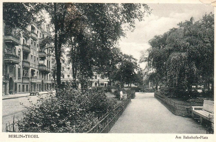 Postkarte Berlin-Tegel, Am Bahnhofs-Platz [heute: Am Buddeplatz] mit Blick zur Bahnhofstraße [heute: Grußdorfstraße]; Quelle: Archiv Michael Grimm, geschichtsforum-tegel.berlin