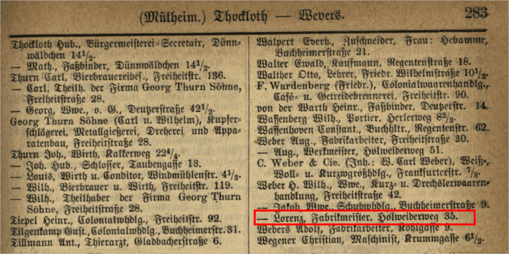 Bearbeiteter Ausschnitt Greven´s Adreßbuch für Köln, Deutz, Kalk, Mülheim, Ehrenfeld, Nippes sowie für die Umgebung Köln´s / 33. Jahrgang 1887; Datenquelle: Universitäts- und Stadtbibliothek Köln