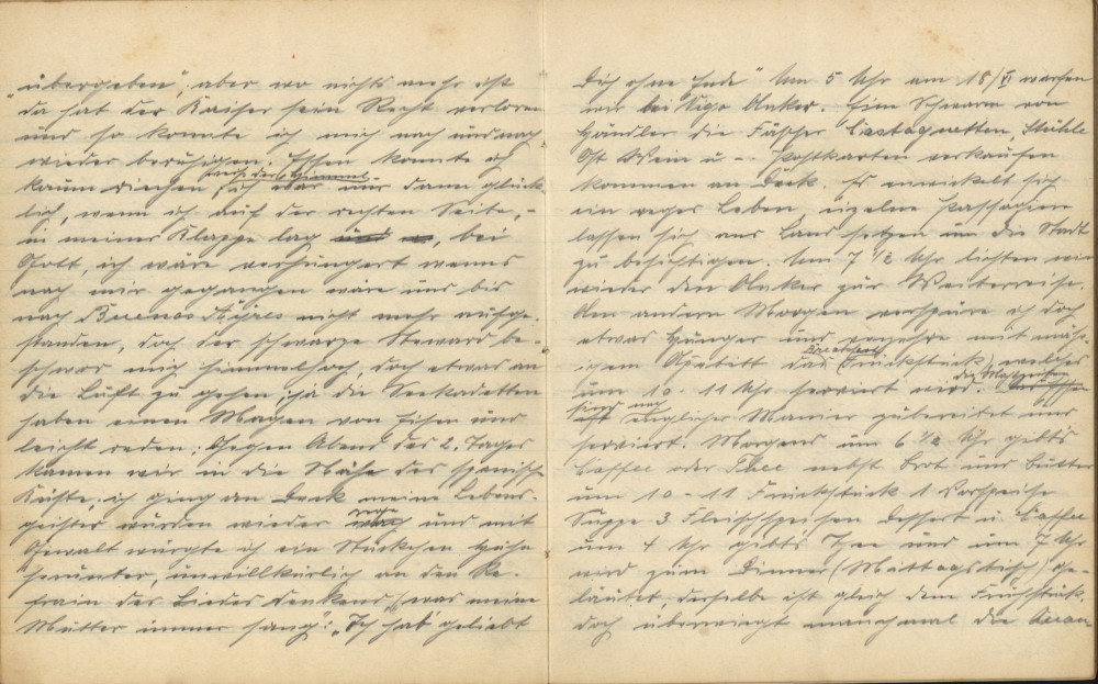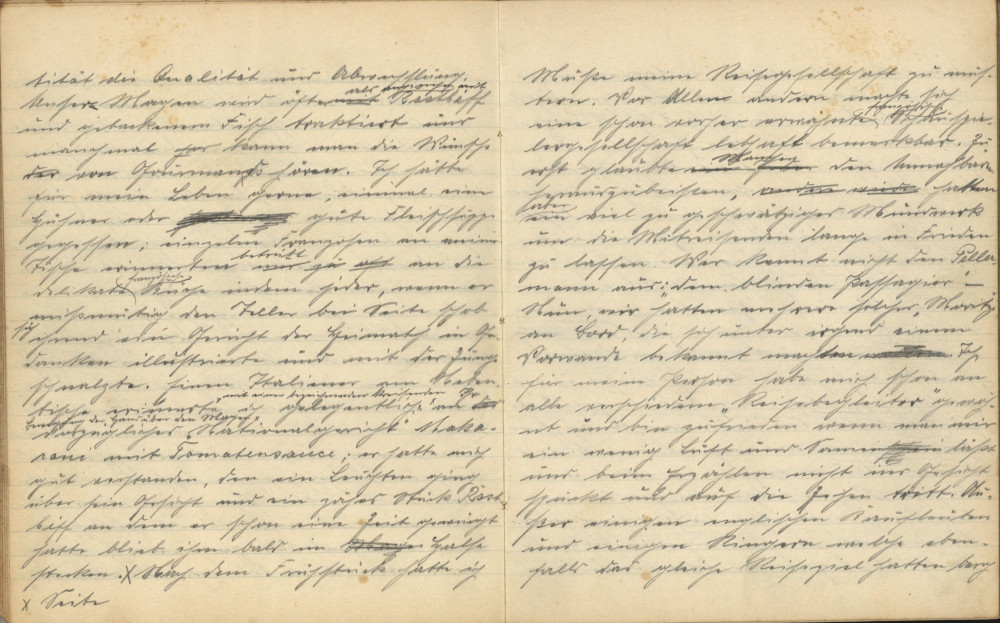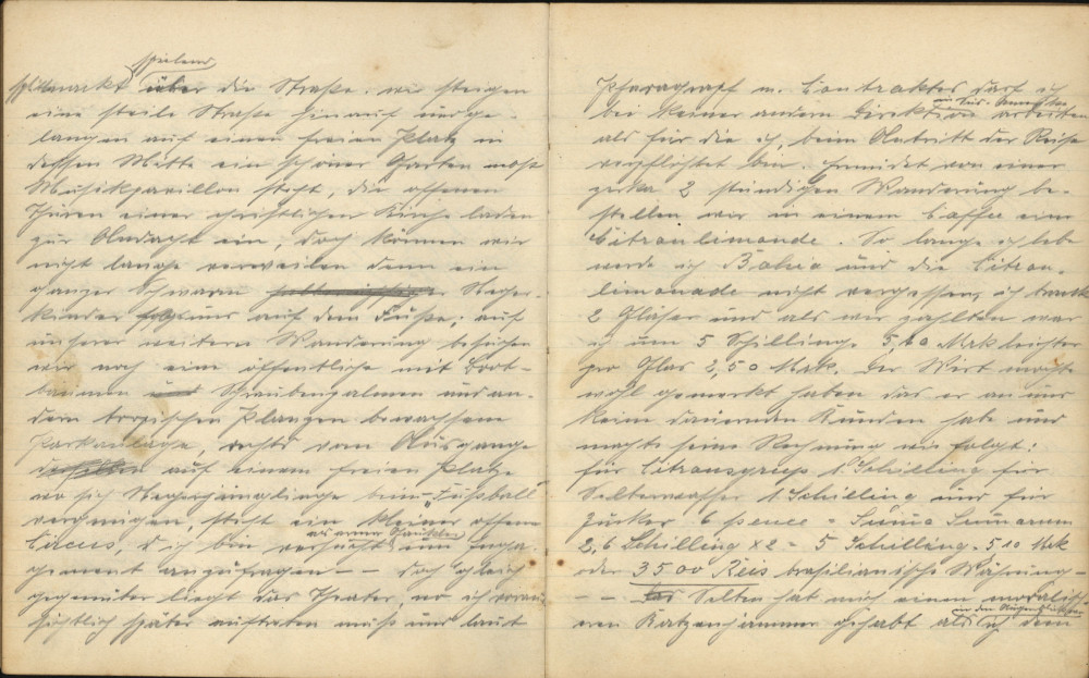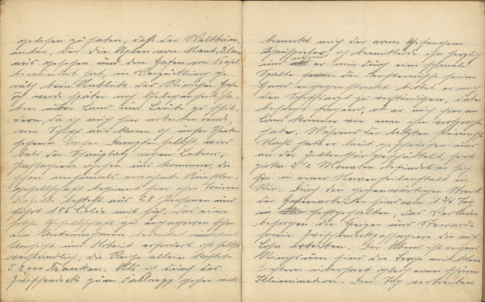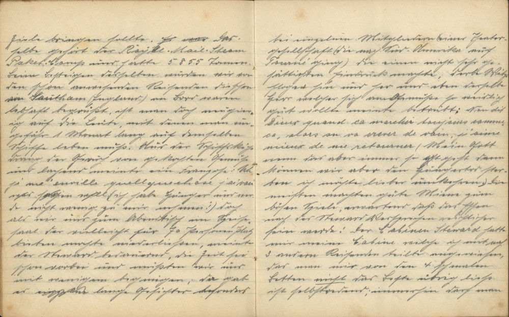 Am anderen Morgen verspüre ich doch etwas Hunger und verzehre mit mäßigem Appetit das Breakfast (Frühstück), welches um 10-11 Uhr serviert wird. Die Mahlzeiten sind nach englischer Manier zubereitet und serviert. Morgens um 6:30 Uhr gibt’s Kaffee oder Tee nebst Brot und Butter, um 10-11 Uhr Frühstück, eine Vorspeise Suppe, drei Fleischspeisen, Dessert und Kaffee, um 4 Uhr gibt’s Tee, und um 7 Uhr wird zum Dinner geläutet, dasselbe ist gleich dem Frühstück. Doch überwiegt manchmal die Quantität die Qualität und Abwechslung. Unser Magen wird öfter als empfohlen mit Roastbeef und gebackenem Fisch traktiert, und manchmal kann man die Wünsche von [unleserlich] hören. Ich hätte für mein Leben gerne einmal eine Hühner- oder Fleischsuppe gegessen; einzelne Franzosen an meinem Tische erinnerten betrübt an die delikate französische Küche, indem jeder, wenn er missmutig den Teller beiseiteschob, sich irgendein Gericht der Heimat in Gedanken illustrierte und mit der Zunge schnalzte. Einen Italiener am Nebentische erinnerte ich gelegentlich mit einer bezeichnenden kreisenden Bewegung mit der Hand über den Magen an ihr vorzügliches „Nationalgericht“ Makkaroni mit Tomatensauce; er hatte mich verstanden, denn ein Leuchten ging über sein Gesicht und ein zähes Stück Roastbeef, an dem er schon eine Zeit gewürgt hatte, blieb ihm bald im Halse stecken.