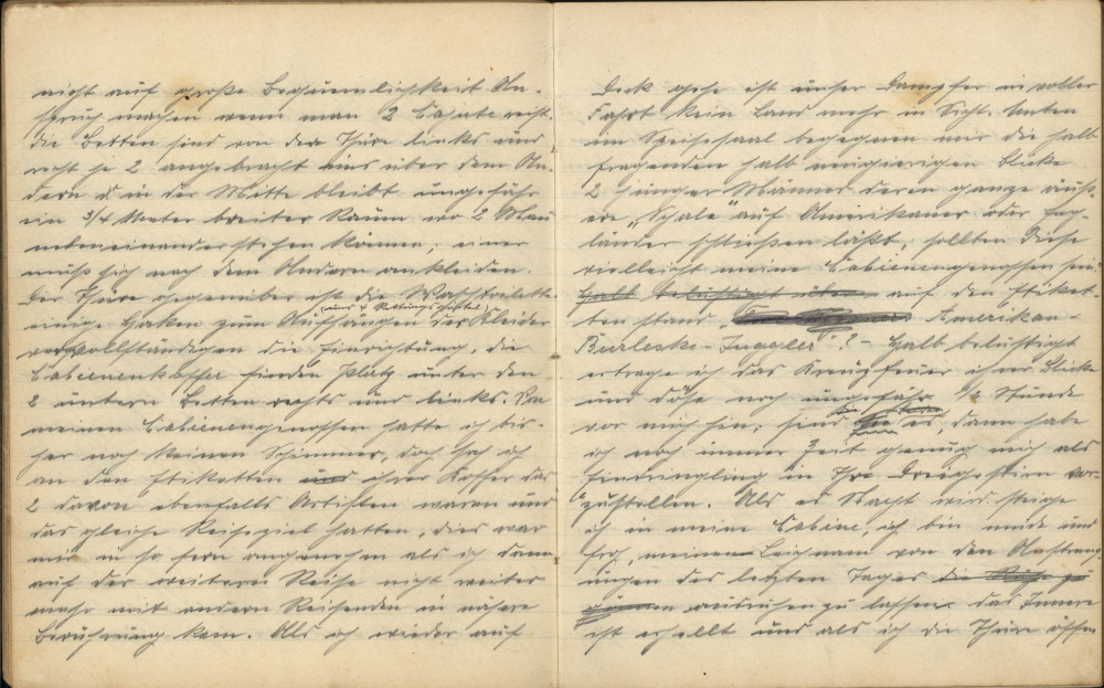 Als ich wieder auf Deck gehe, ist unser Dampfer in voller Fahrt, kein Land mehr in Sicht. Unten im Speisesaal begegnen mir die halb fragenden, halb neugierigen Blicke zweier junger Männer, deren ganze „äußere Schale“ auf Amerikaner oder Engländer schließen lässt; sollten diese vielleicht meine Kabinengenossen sein? Auf den Etiketten stand „American-Burlesque-Inggler“ – Halb belustigt ertrage ich das Kreuzfeuer ihrer Blicke und döse noch ungefähr eine halbe Stunde vor mich hin; sind sie es, dann habe ich noch immer Zeit genug, mich als Eindringling in ihrem Dreigestirn vorzustellen. Als es Nacht wird, steige ich in meine Kabine, ich bin müde und froh, meinen Leichnam von den Anstrengungen der letzten Tage ausruhen zu lassen. Das Innere ist erhellt und als ich die Türe öffne, richten sich zur gleichen Zeit drei Köpfe in die Höhe. Ich hatte recht gesehen; deshalb frage ich auf Englisch: „Excuse me“, doch ich komme nicht weiter, denn der Jüngere musste mich wohl kennen oder hatte auch an der Etikette abgelesen, wer ich war, denn auf Deutsch rief er mir zu: „Wir sprechen och deutsch“ – unverfälschter Berliner Dialekt klang mir entgegen und belustigt frage ich: „Sie sind wohl Wiener?“ „Nee, Berliner!“, antwortete er prompt! – Als wir das Licht ausdrehten, hatten wir schon Einer dem Anderen das Nötigste über Zweck und Ziel der Reise und dergleichen mehr erzählt, ohne dass eine gegenseitige Vorstellung nötig gewesen wäre.