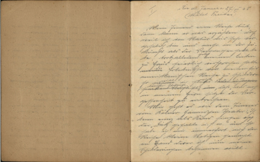 Wie die meisten Leute, die nie oder nur wenig Arbeit haben, am allerwenigsten sich einige Stunden ihrer „kostbaren“ Zeit abspleißen können, so ging es auch mir bisher. Oft hat mich in den ersten beiden Monaten nach meiner Abreise die Langeweile geplagt und doch habe ich nicht die Zeit gefunden, bis heute in Rio, der Haupt- und Handelsstadt von Brasilien. Gestern bin ich hier mit einem italienischen Dampfer angekommen; ich hatte eine viertägige Seereise von Montevideo Maquai, meinem letzten Wirkungsorte. Die Verpflegung war die denkbar beste, was Wunder, dass ich mich heute in vorzüglicher Stimmung befinde. Der Seewind hat mein träges Hirn durchbraust, und so geläutert mögen die Erinnerungen durch meinen rechten Arm und diesen Bleistift fließen, meinen Lieben zu Hause und allen, die sich für mich interessieren, verkündend, wie meine Reise verlief.