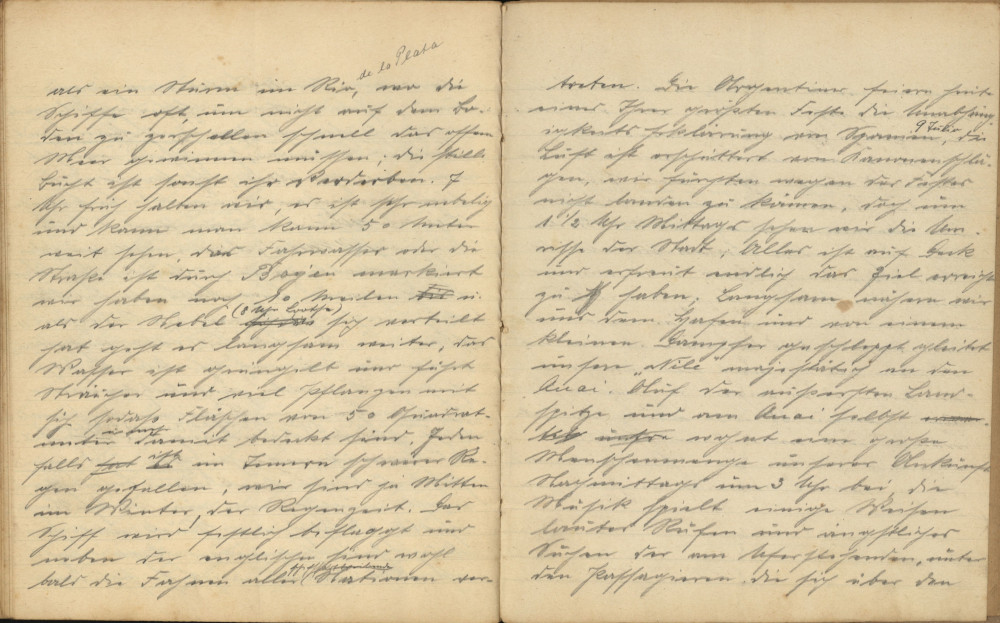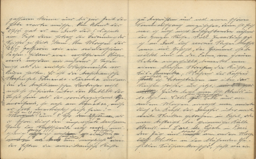 Während des Kaffees verfalle ich in Betrachtungen über das Reisen früher und jetzt. Heute legt man sich abends um 10 Uhr in Köln im Schlafwagen zu Bett und am anderen Morgen erwacht man munter durch die Kraft des Dampfes über meilenweite Strecken getragen in Basel, oder man besteigt bei grimmiger Kälte abends in Gare de Lyon in Paris den Zug und befindet sich am anderen Morgen mitten in den blühenden Gefilden Südfrankreichs, fast wie ein Traum. „Verräter und Mörder!“, brüllte in einer mutigen Revolte die Besatzung den kühnen Kolumbus an, als er einen westlichen kurzen Seeweg nach dem gesegneten Indien suchte, als plötzlich (nach wochenlangem Umherirren) der Matrose im Mastkorbe in den freudigen Ruf „Land, Land“ ausbrach. – Es ist nur 2 ½ Breitengrad nördlich und 3 ½ Längengrad westlich von Pernambuco, wo nach glücklicher Landung Alle dem kühnen Genueser Studenten, Verzeihung erflehend, zu Füßen stürzten! – Wie sicher tragen heute die mächtigen Dampfer täglich Tausende an Passagieren von uns nach Amerika; man steht am Morgen auf und legt sich am Abend wieder zu Bett, fast wie zu Hause, als wenn es nie anders gewesen wäre, und fast möchte man lachen über die Furcht, die man sich vor eine Seereise macht.