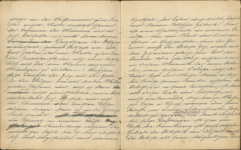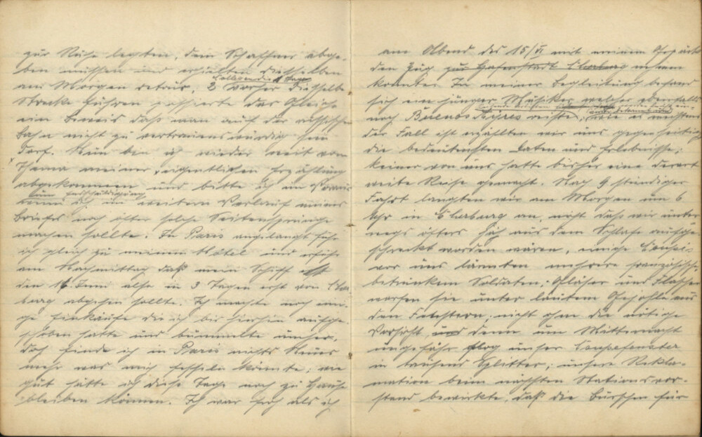 Netta gelingt es sogar, dem Papa mit sicherem Hieb einer Gerte den Hut vom Kopfe zu säbeln, so dass er in weitem Bogen ins Gras fliegt. Der kleine Bruder Jakob, der uns begleitete, machte allerlei exzentrische Bock- und Luftsprünge, und als ich mir noch mit wichtiger Miene für die Reise am Bahnhofsautomat eine Taschenapotheke, die weiter nichts enthielt als eine Nadel, ein Stückchen Zwirn, ein erbsengroßes Stückchen Zucker, zwei leere Glasröhrchen, die einstmals Salmiakgeist und Hoffmannstropfen enthielten, „zog“, da gab es wahre Lachkrämpfe, so dass ich bald genötigt war, meine neue Apotheke zu gebrauchen; wer den Schaden hat, braucht für den Spott nicht zu sorgen. Ein Unbeteiligter hätte nicht ahnen können, dass diese heiteren Menschenkinder sich am Folgetage für 4-5 Monate trennen mussten. Wie gerne hätte ich mein Frauchen mitgenommen, jedoch kamen wir mit Recht zu dem Schlusse, dass es besser sei, wenn ich diese beschwerliche Reise alleine mache; es hat mich nicht gereut. Wahrscheinlich saßen wir drei, „Familie Weber“, am Montagabend in einem Restaurant, als ich mit Staunen merkte, dass es Zeit sei, aufzubrechen; mein Zug ging um 10 Uhr und blieben uns nur noch knapp ¾ Stunden; mit Absicht hatte ich mich aufgehalten, die Trennung fällt dann weniger schwer; der Hauptbahnhof war überfüllt und mein Zug Köln-Paris stand schon in der Halle; mit Mühe erkämpfte ich mir einen Platz II. Güte, um meinem fernen Ziele zuzustreben; der Waggon war so gepackt voll, dass ich, nachdem meine Sachen untergebracht waren, nicht mehr Gelegenheit hatte, mein Weib und Kind ein letztes Mal zu küssen, doch Traudchen wusste Rat und klomm flugs an der Gleismauer zum Fenster empor; Netta verfolgte schreiend das Beginnen der [unleserlich], und als sich dasselbe nochmals bei längerem Verzögern der Abfahrt wiederholt, springt lebhaft ein alter Herr herbei, der mir Netta zum Fenster hinaufreicht, um noch einen letzten Kuss auf das vom Weinen verzogene Mündchen zu drücken …! Langsam dampft der Zug aus der Halle, in den Augen meines lieben Weibs perlen Tränen und auch ich kann mich nicht zurückhalten, mein Blick verdunkelt sich, ich sehe nur noch das Flimmern von weißen Taschentüchern, lange starre ich in die schwarze Nacht hinaus. Es wühlt ein Schmerz in meiner Brust. Stundenlang während der nächtlichen Fahrt bin ich tief unglücklich und unzufrieden mit meinem Schicksal.