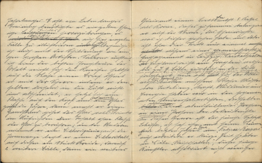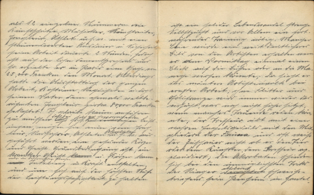 „Des Lebens ungetrübte Freude wird keinem Irdischen zuteil!“ Dies ist eine Schattenseite in meinem Berufe; fern von Weib und Kind, von Eltern und Geschwistern, fern der Heimat muss der Artist sich, einem üblen Zigeuner gleich, sein Geld verdienen. Wie glücklich erscheint mir in diesem Moment der arme Arbeiter, mein früherer Kollege; nach des Tages Last und Mühe kann er sich im Kreise seiner Familie erholen; der Artist (der reisende Künstler) ist bar all dieser Liebe und Fürsorge, er muss meilenweite, tagelange Reisen per Bahn und Schiff machen, um seine Künste vor einem interessierten Publikum zu zeigen; Verständnis und der Dank desselben für seine Leistungen ist ihm ein Trost. Die Konkurrenz ist groß auf dem Gebiete der Artistik und deshalb muss der Artist all seine körperlichen und geistigen Fähigkeiten in Anspruch nehmen, um der Konkurrenz standzuhalten. Das Leben des Artisten, welcher uns am Abend im Theater seine Künste zeigt, ist hart und voller Entbehrungen; unter der lachenden Stirne verbirgt sich tiefer Ernst und nicht umsonst heißt es: „Der Artist ist ein Priester der Kraft, ein falscher Blick oder Tritt kann ihm seine gesunden Glieder oder gar das Leben kosten!“ Während die Zuschauer früher noch ein reines Vergnügen an guten, heute kaum noch beachteten Leistungen hatten, verlangen sie heute fast Unmenschliches; das Publikum ist ein Dämon, welcher schrecklich ist. Mit Abscheu hört man die Berichte spanischer Stiergefechte an und verdammt die Blutgier der Spanier. – Doch der Nervenkitzel des Publikums verlangt allein im mittleren Europa jährlich viele Tote und Verwundete. In Paris werden ungezählte Tausende an Honorar jährlich demjenigen Artisten ausgezahlt, welcher noch nie Dagewesenes zeigt. Die Welt staunte, als die ersten Schleifenfahrer auftraten; der Trick bestand darin, dass ein Radfahrer von einer Höhe von 20-25 Meter auf einer steilen Bahn hinabstürzte, in einer offenen Schleife rundfuhr, derart, dass der Kühne mit seinem Rad für einen Moment wie eine Fliege an der Decke mit dem Kopf nach unten hing. „Mastijho“, ein Freund von mir, welcher 1901 mit mir zu gleicher Zeit in Paris im „Casino“ engagiert war, erhielt für dieses Wagestück zig 1.000 Franken. Viele mit uns haben nach ihm diese Arbeit mit Erfolg gezeigt, aber auch viele sind dabei verunglückt, zumal man den Apparat vielfach umänderte. Da das Publikum sich an dieser Leistung fast genug gesehen hatte, sann der findige Artist auf neue, noch gefährlichere Tricks und so entstand die offene Schleife, wo die Bahn im Moment, wo der Fahrer mit dem Kopf nach unten steht, überhaupt auf eine Distanz von 4-7 Meter unterbrochen ist. Alles schüttelte mit dem Kopf, als vor zwei Jahren in Paris „Olympia“, der „menschliche Pfeil“, auf riesigen Plakaten angekündigt wurde; der Fahrer sauste mit seinem Rad (schnell wie ein Automobil) von einer schiefen Bahn und fetzte dann über einen Abgrund von 15 Metern wie ein Pfeil durch die Luft fliegend hinweg. Im „Moskau Aquarium“ mit mir war seiner Zeit ein junger Mann engagiert, er sprang von dem Dache des Theaters zirka 28-30 Meter in ein Bassin, welches kaum 2,5 Meter breit und 4 Meter lang war. Später ist er in Hamburg zu Tode gestürzt, als einmal zu wenig Wasser im Bassin war. In England erregte zur Zeit ein Jockey Sensation, welcher im Innern eines Kronleuchters einen tollen Ritt ausführte. Radrennen [unleserlich] mit innen offener Piste, frei in der Luft, hat man in fast jeder größeren Stadt gesehen; die meisten dieser Tricks tragen dem Nervenkitzel des Publikums Rechnung; bei oben angeführten wie auch bei den heute so modernen Radrennen hinter Motoren spielt mehr die Tollkühnheit, die Macht des Geldes, als Leistungsfähigkeit und Ehre die antreibende Kraft; sind diese Leistungen nun zur Befriedigung mancher gegen andere [unleserlich] neuer geeignet. So haben wir auch wiederum andere Artisten, deren Leistungen ebenfalls an das Unmögliche grenzen. Jahrelanges, oft ein lebenslanges Training benötigte es, einzelne schwierige Tricks hervorzubringen, es lohnt sich auch hier, einzelne Fälle zu illustrieren, und da begnüge ich mich mit der Schilderung von einigen großen Artisten. Salerno, unstreitlich einer der besten Jongleure der Welt, wirft sich den Kneifer selbst auf die Nase; einen Brief öffnet er mit der Schere, indem er denselben mit der Hand in die Luft wirft und abschneidet; er setzt sich eine Flasche auf den Kopf und nimmt ein Glas zwischen die Zähne, dann macht er einen Handstand, gießt das Glas voll und trinkt im Aufrichten den Inhalt, ohne Flasche oder Glas zu berühren; unter anderem nimmt er ein Billardqueue, auf die Pomeranze legt er einen Billardball, auf diesen ein Stück Kreide, darauf zwei weitere Bälle, dann ein weiteres Queue mit einem Brettchen nebst fünf Kegeln als Krone, dieses zusammen balanciert er auf der Stirne – das Schwierigste, was ich bisher gesehen habe, und dabei ist ihm der Trick nur einmal während eines gemeinschaftlichen Engagements im „Leipzig Crystal-Palace“ missglückt. In England reist ein Jongleur, welcher bis zu neun Bälle zugleich in der Luft jongliert; wenn man bedenkt, dass ein guter Jongleur vier bis fünf Bälle zugleich jongliert, wird man begreifen, wie oft sich der Arme wohl beim Training hat bücken müssen. Wahre Muster von Intelligenz, Kraft, Ausdauer und Energie haben wir in den sogenannten Universalartisten, dieselben bestreiten ein abendfüllendes Programm in einer Person. Der Bedeutendste, mir bekannte in diesem Genre ist der junge Sylvester Schäffer, ich sah ihn mit seiner Nummer Ende letzten Jahres in Paris im „Folies Bergère“, auch arbeitete er kurze Zeit später im Kölner „Reichshallen-Theater“; dieser junge Künstler absolviert nicht weniger als zwölf einzelne Nummern wie Kunstschütze, Musiker, Kunstreiter, Jongleur, Athlet usw. mit einer staunenswerten Ausdauer und Sicherheit; seine Arbeit dauerte zwei Stunden, jedoch ist auc